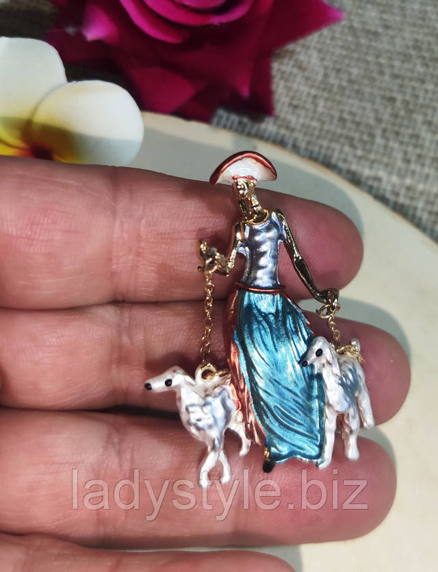 Елегантна незвичайна брошка — кулон — дама з собаками афганськими борзиками. Дуже красива та елегантна брошка-кулон (ззаду є петелька, куди можна просмикнути ланцюжок і носити на шиї)